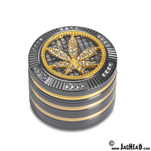 The top features a striking weedleaf design , inlaid with decorative diamonds, creating a premium and stylish look. The magnetic lid keeps the grinder securely closed while grinding.
