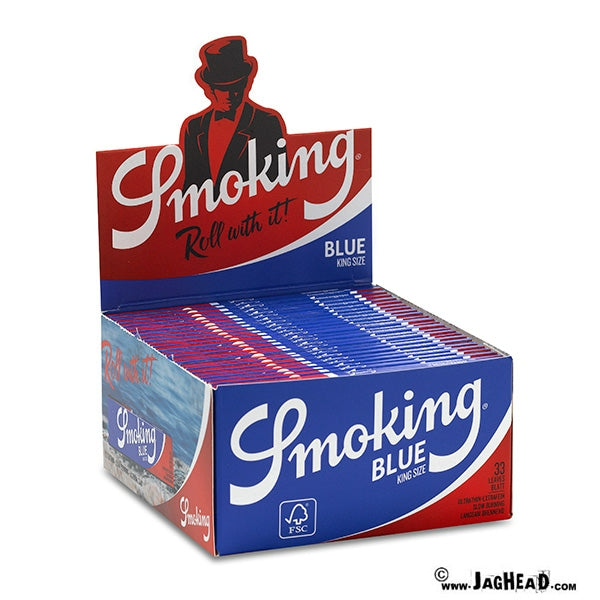 Smoking Blue is zeer geliefd onder de smokers! Niet voor niets is dit samen met Smoking Gold één van de bestverkochte vloeitjes in Europa en daarbuiten. Smoking Blue wordt geproduceerd in Spanje. Deze dunne en brede vloei brandt gelijkmatig en langzaam. Gemaakt van 100% natuurlijk plantaardig materiaal. De plakrand van Smoking Blue is volledig gemaakt van gom. Smoking vloei wordt geproduceerd zonder kleurstoffen of andere toevoegingen. Smoking heeft een FSC-keurmerk en hun eigen Smoking watermerk. Een pakje Smoking Blue vloei bevat 33 vloeitjes in Kingsize formaat met een papier dikte van 13 g/m2. Met een lengte van 108 mm en een breedte van 52mm. Geschikt voor medium tot (extra) dikke joints.